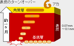 新しい細胞は、基底層で作られ、少しずつ形をかえながら、上の層へ押上げられ、やがてアカとなってはがれ落ちていきます(例えば日焼けをしても、右図のように、正常なターンオーバーを繰り返していればお肌は、元通りになるはずです)。